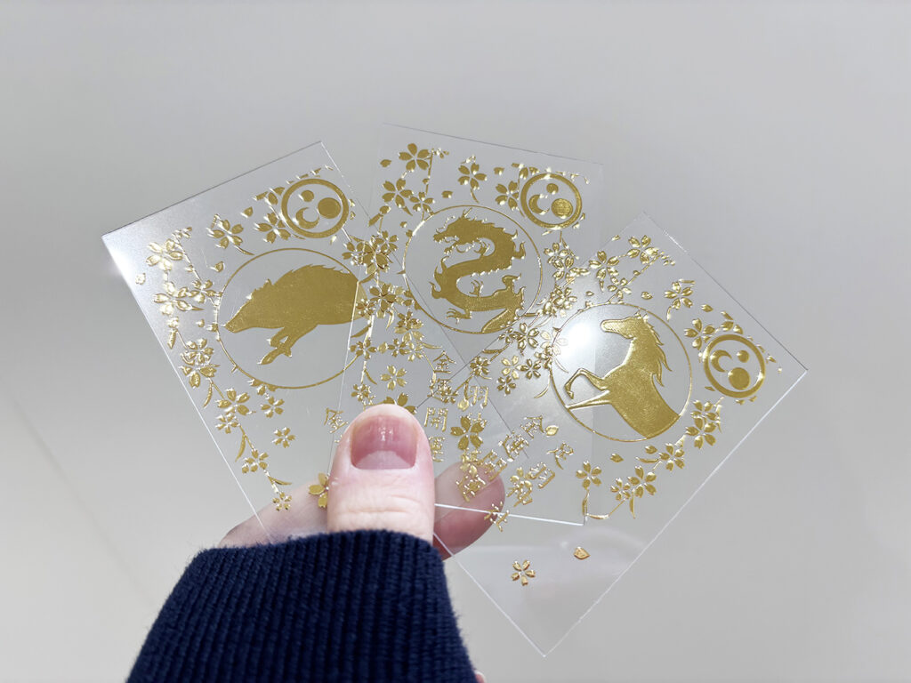 クリア素材にゴールドの箔印刷を施すことで、日本の伝統工芸「金蒔絵」のような立体感と輝きを表現。透明感の中に金の華やかさが際立ち、金運のお守りにふさわしい気品を演出しています。