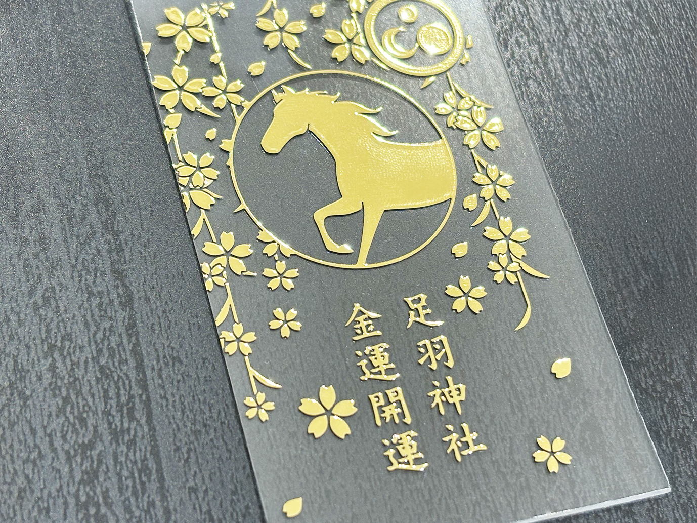 クリア素材にゴールドの箔印刷を施すことで、日本の伝統工芸「金蒔絵」のような立体感と輝きを表現。透明感の中に金の華やかさが際立ち、金運のお守りにふさわしい気品を演出しています。